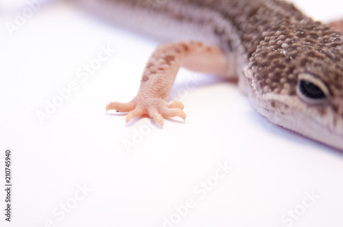 © Heather Shimmin, Naklejka premium Close up of common leopard gecko (Eublepharis macularius) looking at camera. Gecko lizard on white background in studio with macro lens. Shallow depth of field. Focus on eyes and head, head cropped.
