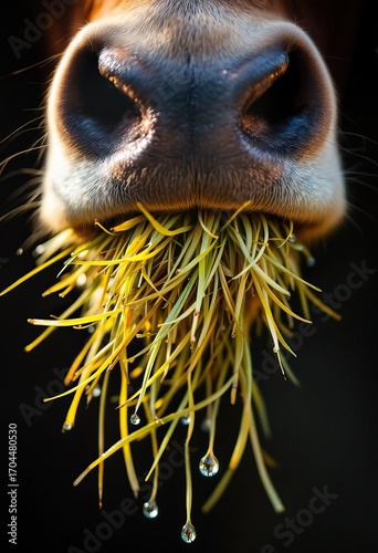© Ket, Fototapeta premium Close-up of cow muzzle eating fresh green grass with water droplets