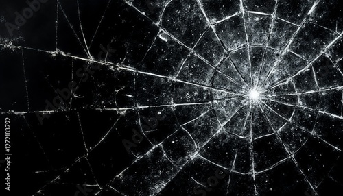 Obraz premium Close-up of cracked glass with intricate spider web pattern on dark background