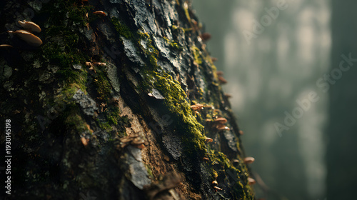 Obraz premium Close-Up of Damp Tree Trunk with Moss and Small Mushrooms