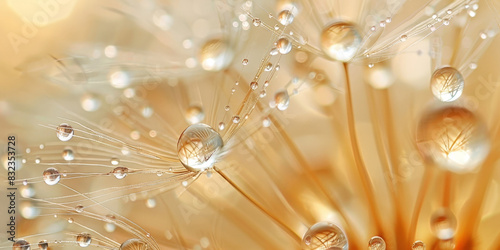 © Nice Seven, Obraz premium Close-up of dandelion seeds with dew drops in golden light, capturing the delicate beauty and intricate details of nature's morning magic