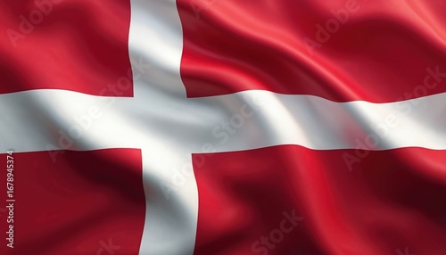 © Vadym, Fototapeta premium Close-up of Danish flag waving in wind. Red banner features white Scandinavian cross symbol. This three-dimensional illustration of national flag evokes patriotism and national pride for Denmark.