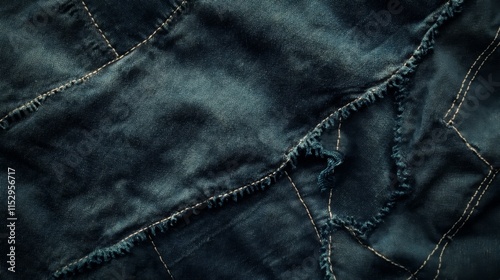 Fototapeta premium Close-up of dark blue denim fabric with visible stitching and frayed edges.
