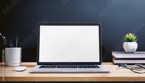 © l1gend, Fototapeta premium Close up of dark designer office desk with mock up laptop on wooden table. 3D Rendering.