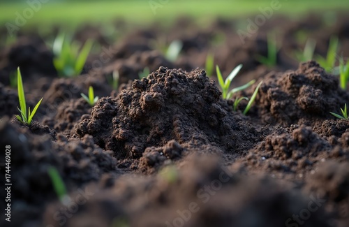 © Viktor, Fototapeta premium Close up of dark rich brown soil lumps. Freshly plowed garden land shows texture, small green plants grow from fertile earth. New life emerges in agricultural field, farm ground ready for spring crop