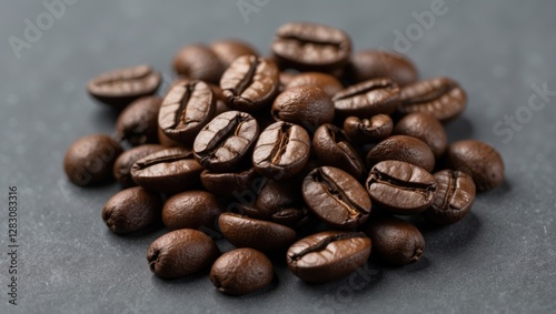 © Kultivad, Naklejka premium Close up of dark roasted coffee beans arranged on a textured gray background showcasing their rich color and unique shapes.