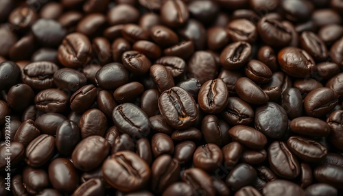 Fototapeta premium Close-up of dark roasted coffee beans, oily sheen, uneven surface, surface,...