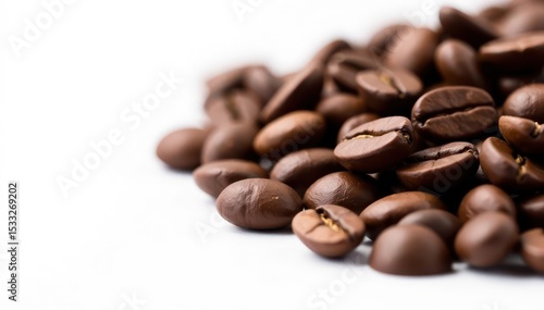 Naklejka premium Close-up of dark roasted coffee beans on white background, rich, roasted,...