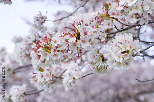 © Defri Ridho, Obraz premium Close-up of delicate cherry blossoms in full bloom against a soft, light sky.