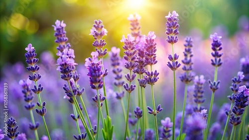 Naklejka premium Close-up of delicate lavender flowers in a lush garden setting, purple...
