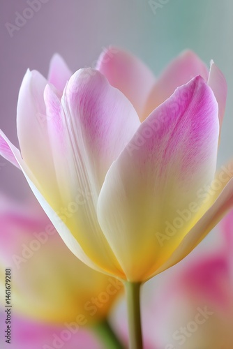 © Divine123victory, Fototapeta premium Close up of Delicate Pastel Pink and Yellow Tulip Petals