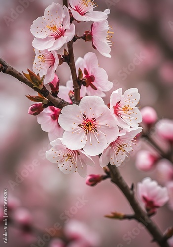 © Ganang, Obraz premium Close-up of delicate pink blossoms on a branch.