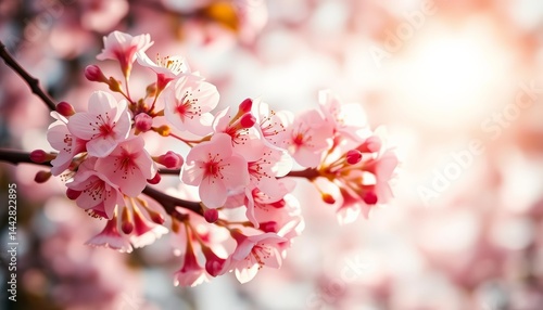Obraz premium Close-up of delicate pink cherry blossoms on branches, soft sunlight, blurred...