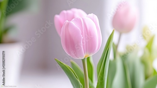 Fototapeta premium Close-up of delicate pink tulips. Soft focus on vibrant blossoms. Spring flowers in a home