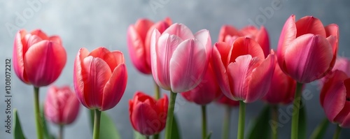 © chanwut, Fototapeta premium Close up of delicate tulip petals in shades of red, pink, and purple on a gray backdrop, backdrop, pink