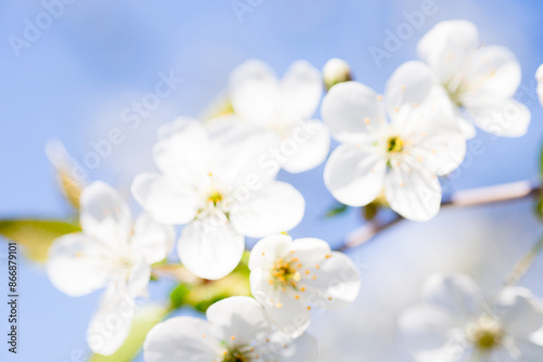 © Maryna, Obraz premium Close-Up of Delicate White Blossoms Against a Blue Sky on a Sunny Day