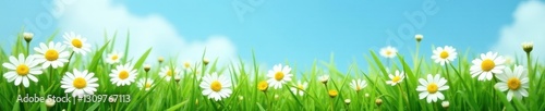 Fototapeta premium Close-up of delicate white daisies amidst lush green grass, clear blue sky...