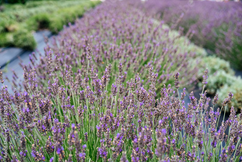Naklejka premium Close-up of densely blooming lavender rows representing large-scale...
