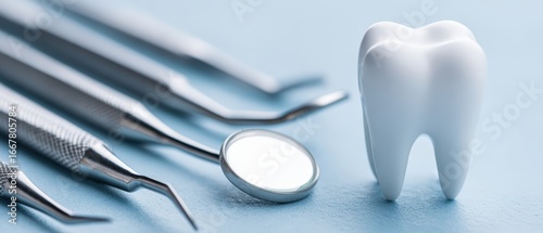 Fototapeta premium Close-up of dental tools including mirror probe and scaler alongside a healthy model tooth on a dental clinic blue background