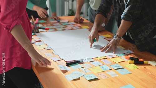 Obraz premium Close up of developer team using mind map to brainstorm idea. Top view of skilled group of business people working together writing marketing strategy by using markers and sticky notes. Symposium.