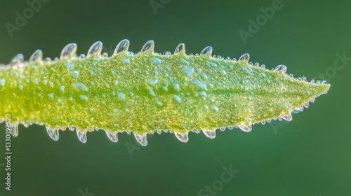 © AlfaSmart, Naklejka premium Close-up of dew-covered green leaf with spiky edges in nature