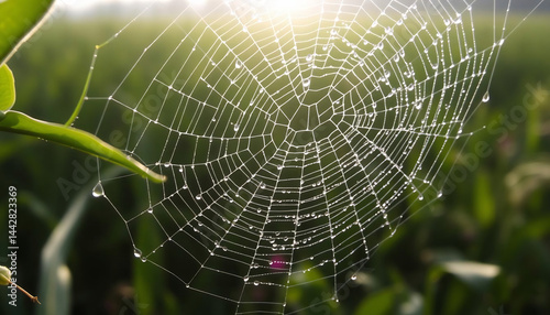 © hwsky, Naklejka premium Close-Up of Dew-Covered Spider Web