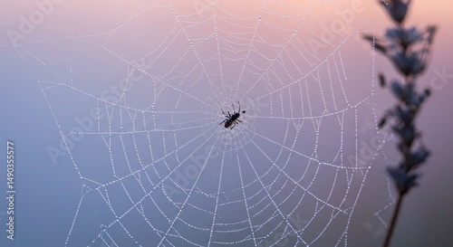 © Afif, Obraz premium Close-Up of Dew-Covered Spiderweb at Sunrise