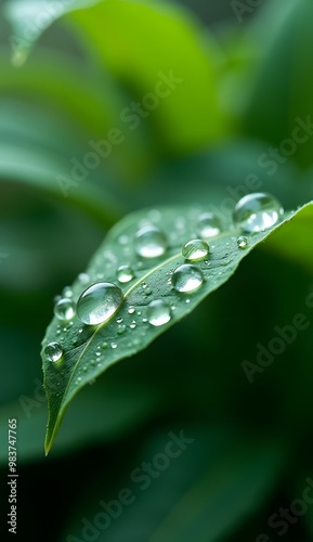 © kenpaul, Fototapeta premium Close-Up of Dew Drops on a Leaf for Phone Wallpaper.