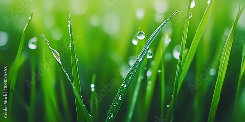 © andyaziz6, Fototapeta premium Close up of dew drops on blades of grass.
