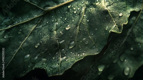 Fototapeta premium Close-up of dew drops on dark green leaves.