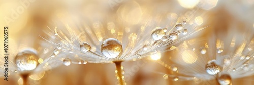 © dreamer, Fototapeta premium Close-Up of Dew Drops on Delicate Dandelion Seeds, Showcasing Nature’s Beauty in Macro Photography with Soft Golden Light and Details