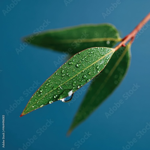 © Kan, Obraz premium Close-up of dew gliding on eucalyptus leaf, peaceful forest background