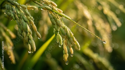 © Plaifah, Obraz premium Close-Up Of Dew-Kissed Rice Plant With Ripening Grains In Sunlight, Showcasing Nature's Beauty And Agriculture's Bounty In A Serene Environment