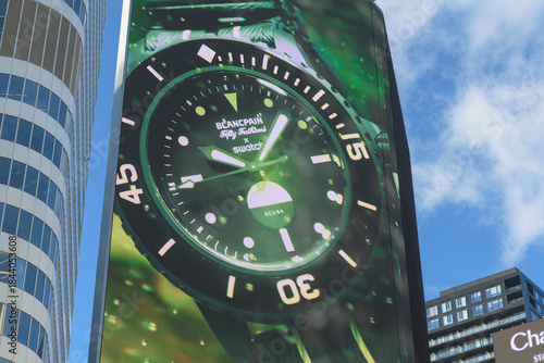 © eugen, Naklejka premium close-up of digital advertisement featuring Swatch x Blancpain collaboration (Blancpain’s iconic Fifty Fathoms) dive watch facing Sankofa Square, Toronto
