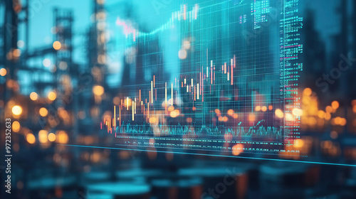 © Xingguo, Obraz premium Close up of digital business stock market screen showing fluctuating oil price graph with oil barrels and financial chart elements in background.