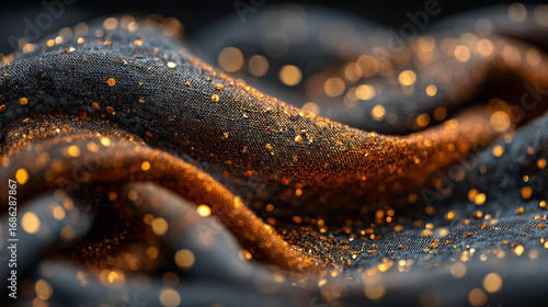 © Muslima, Fototapeta premium Close up of draped fabric with gold glitter and bokeh light background.