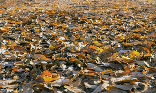 Obraz premium close up of dried leaves of autumn, autumn season, leaves on ground, red and yellow fall leaves