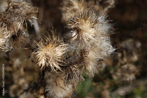 Obraz premium Close-up of dried thistle seeds in sunlight