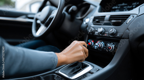 Naklejka premium Close-up of driver’s hand shifting automatic gear in modern car interior.
