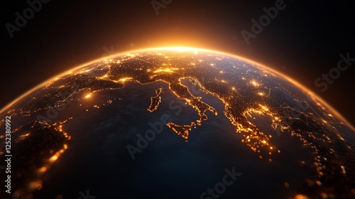 © Alexey, Obraz premium Close-up of Earth with glowing cities and network connections illuminated by a golden sunrise isolated on a dark background. Generative AI