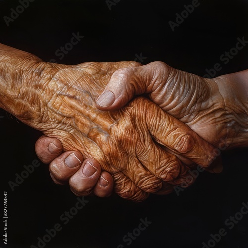 Fototapeta premium Close-up of elderly hands holding each other, symbolizing care, support, and intergenerational connection on a dark background.