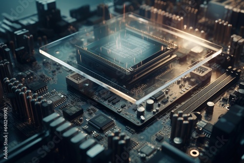 Fototapeta premium Close up of electronic circuit board with microchips. 3d rendering. Generative AI.