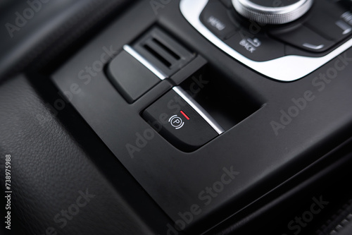 Obraz premium Close-Up of Electronic Parking Brake Control: Modern Vehicle Interior with...