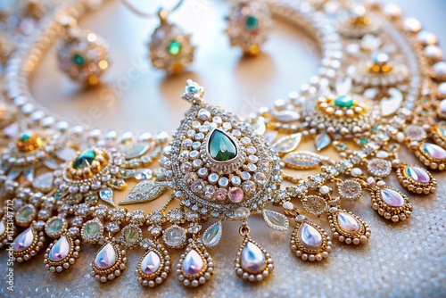 © Adisorn, Obraz premium Close-up of Elegant Bridal Jewelry: Delicate Necklace and Earrings