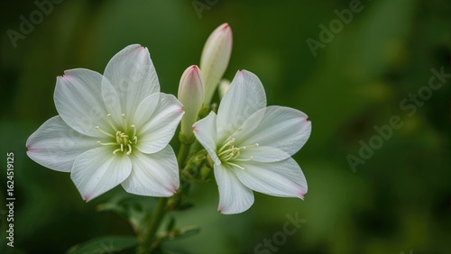 Fototapeta premium Close-up of elegant white eustoma blossoms with pink-edged petals against a blurred green backdrop
