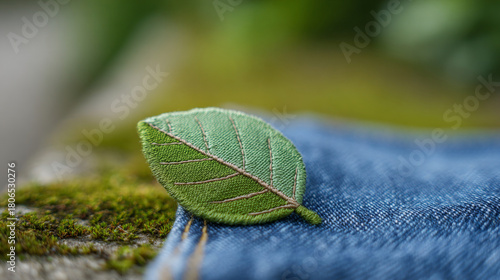 © perfectlab, Fototapeta premium Close-up of embroidered green leaf patch on blue denim fabric with mossy surface background in soft natural light