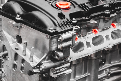 Fototapeta premium Close-up of engine cylinder block undergoing service repair, industrial...