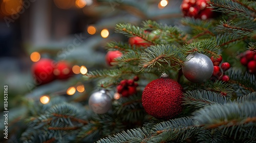 Fototapeta premium Close-up of evergreen branches adorned with vibrant red and silver ornaments, surrounded by soft glowing lights, creating a festive holiday atmosphere with seasonal charm