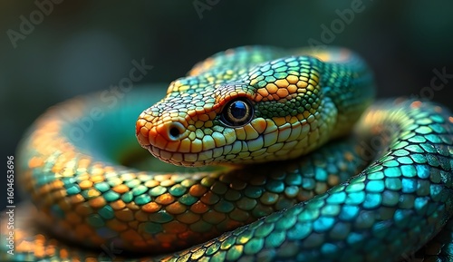 © Teerada, Fototapeta premium Close-Up of Exotic Green Snake with Shiny Scales
