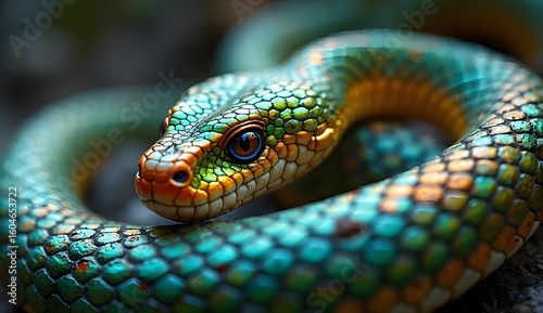 © Teerada, Fototapeta premium Close-Up of Exotic Green Snake with Shiny Scales